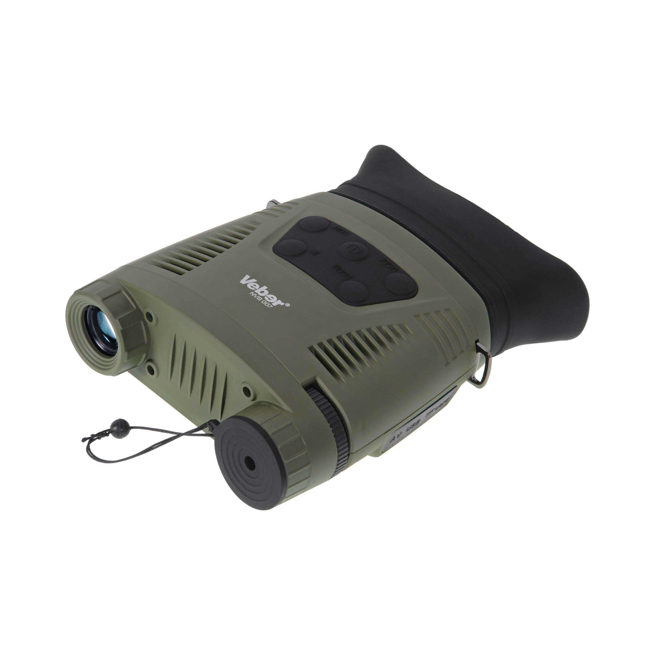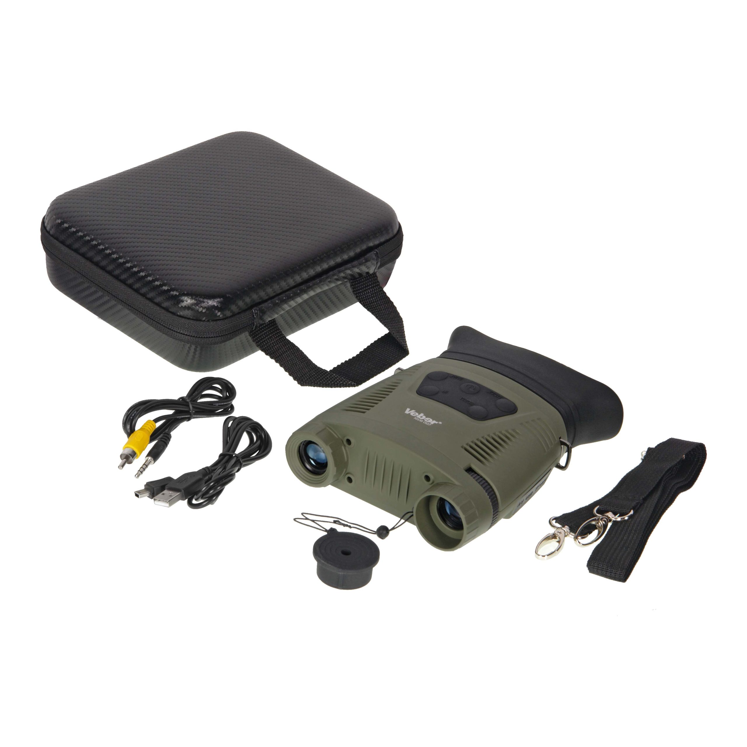 Бинокль ночного видения Veber NVB 007HD – цифровой бинокль с инфракрасным излучателем (ИК-подсветкой) и функциями съемки, хранения и воспроизведения отснятых материалов. Базовое увеличение бинокля 4х может быть расширено до 14х за счет цифрового (1х…3.5х).