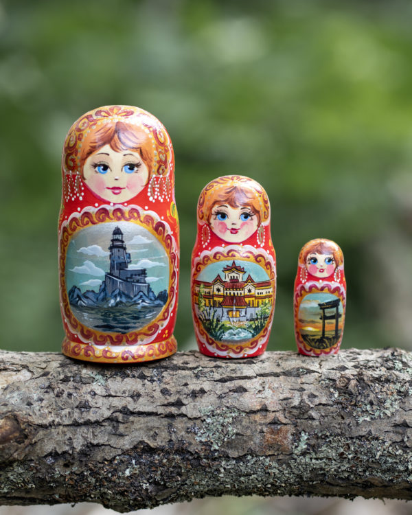 Матрешка Сахалин 3-х предметная ( Маяк Анива,музей,Тори )
