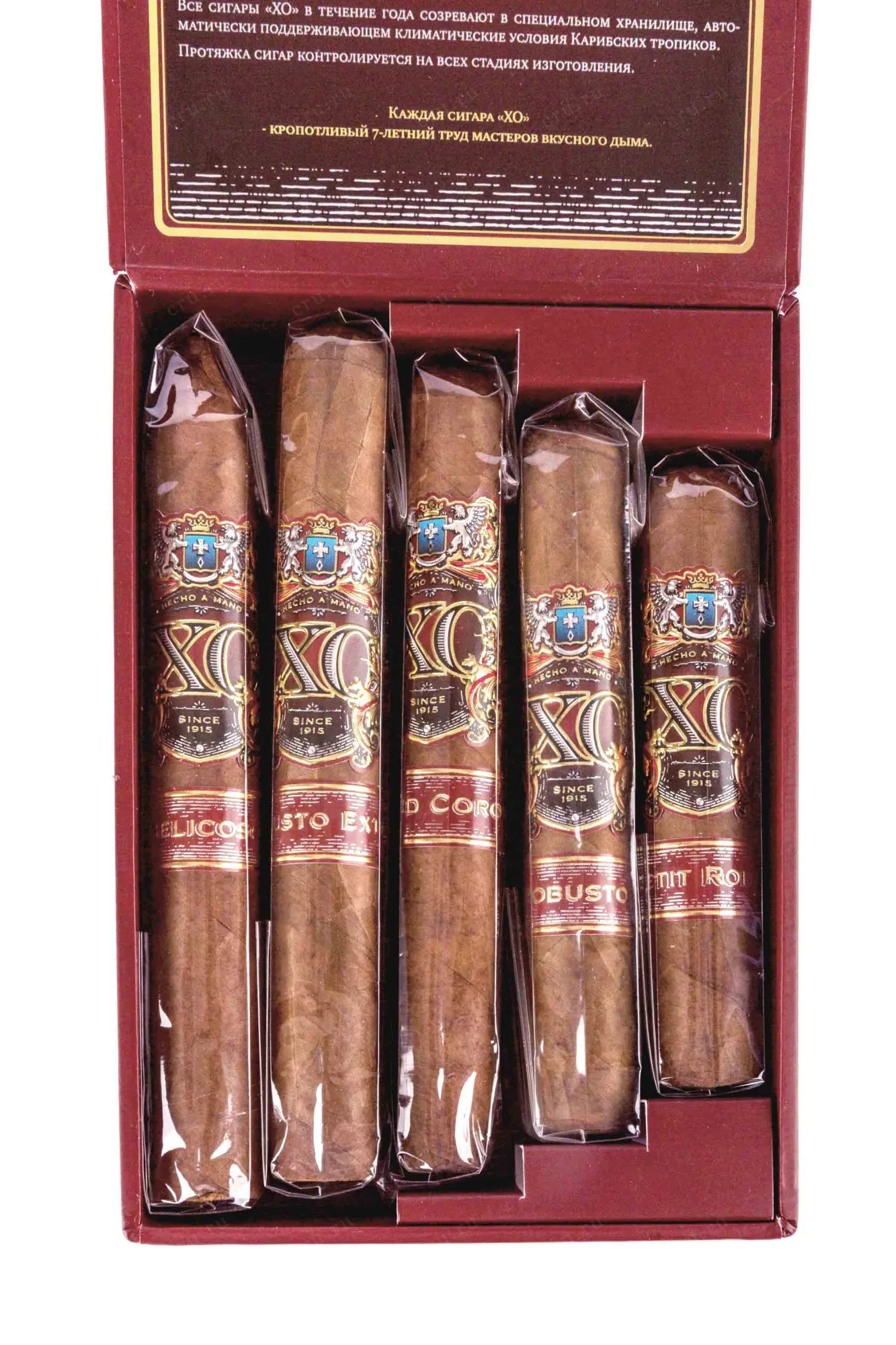 Набор сигар «XO Coleccion Clasica» — это 5 сигар разного формата в одной коробке. В деликатном мягком вкусо-ароматическом профиле дыма хорошо уловимы фруктовые тональности, перетекающие в ванильный оттенок на фоне длительного древесно-ванильного послевкусия с присутствием горчинки свежемолотого кофе, ноток жареных орехов, хрустящей корочки хлеба и темного шоколада.