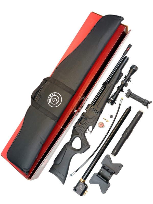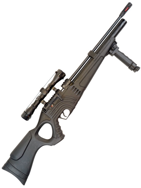 Комплектация: винтовка, насос, прицел 4×32, пули, сошки, саундмодератор, чехол, инструкция